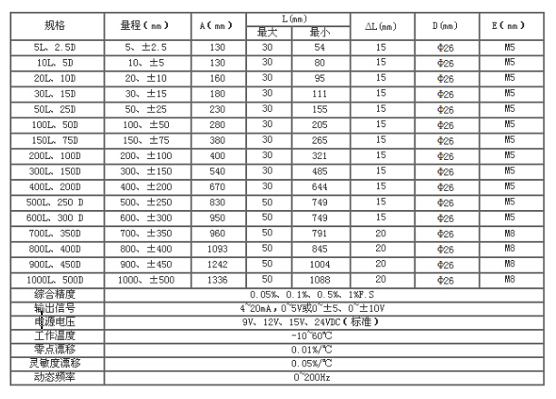 直流差動(dòng)變壓器式位移傳感器,被廣泛地用于測量予先被變成位移的各種物理量,如伸長、振動(dòng)、膨脹、應(yīng)變、重量等。由于其工作影響帶寬,工作可靠,反應(yīng)時(shí)間常數(shù)小,抗惡劣環(huán)境性能強(qiáng),被廣泛應(yīng)用于工礦企業(yè),國防工程及大專院校測量位移物理量的靜態(tài)特別是動(dòng)態(tài)。
